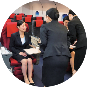 家族旅行、新婚旅行、ビジネストラベル。お客様のさまざまな思いを乗せたフライトが、安全で快適であるようにサポートするプロフェッショナルがキャビンアテンダント(CA)とグランドスタッフ(GS)です。国内外のお客様に質の高いサービスを提供できる英語力はもちろん、接遇スキルや洗練された所作などもしっかりと身につけます。