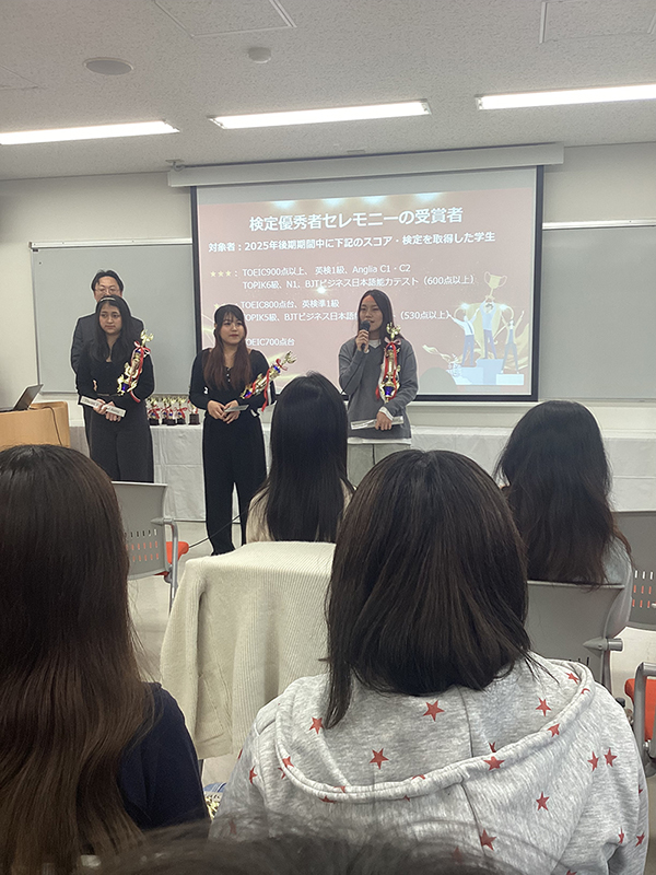 グローバルホテルコース・グローバルビジネスコース新2年生は、昨年度、TOEICや日本語に関する検定に取り組み優秀な成績を収めたので表彰されました。