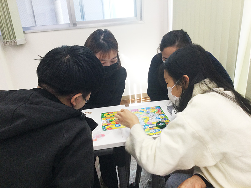 人生ゲームにみんなで取り組みました。仕事の選択から人生の分岐点での選択など