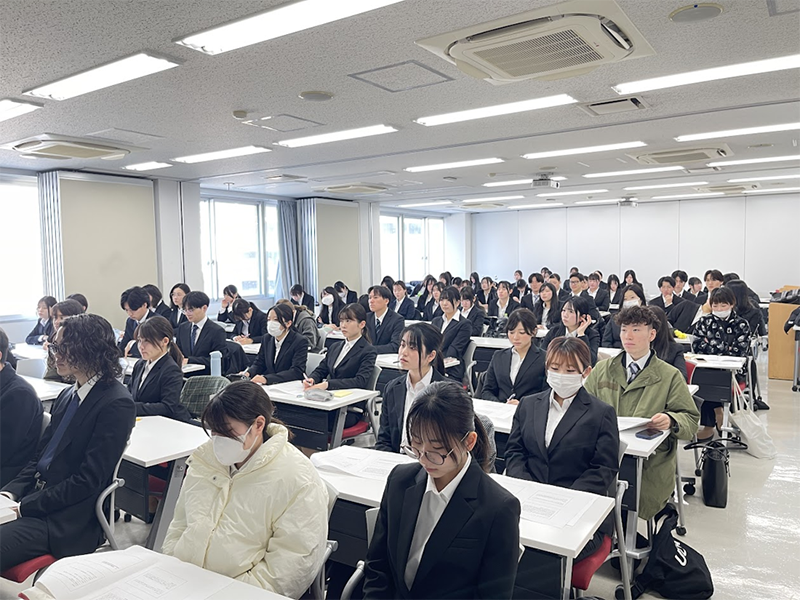 入学直後から始まるキャリアセンターの手厚いサポートは、本校の大きな魅力のひとつです。この日は、これから本格化する就職活動に向けたガイダンスが実施され、学生たちは真剣な表情でキャリアセンター教員の話に耳を傾けていました。