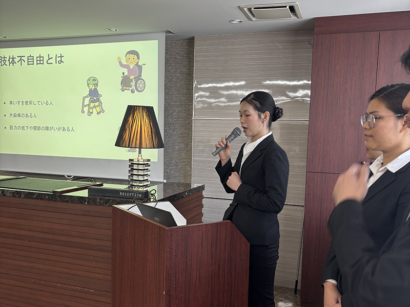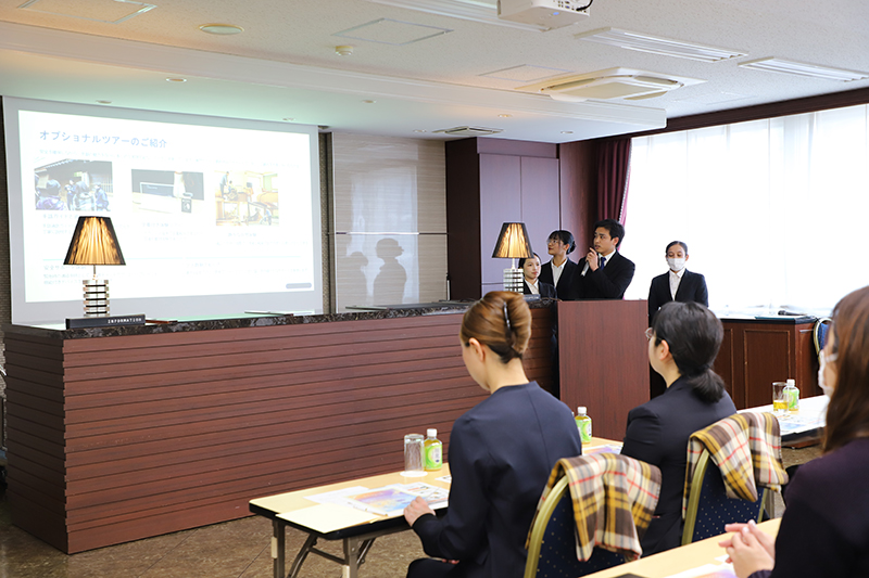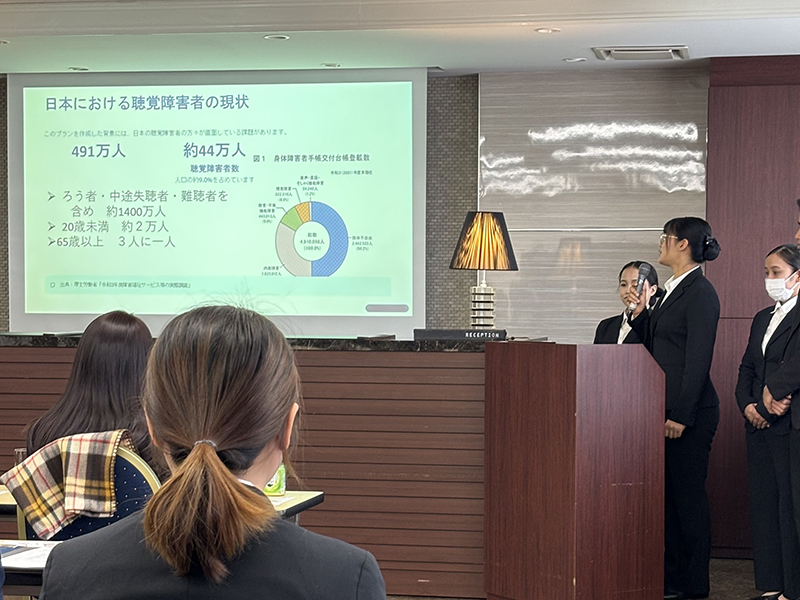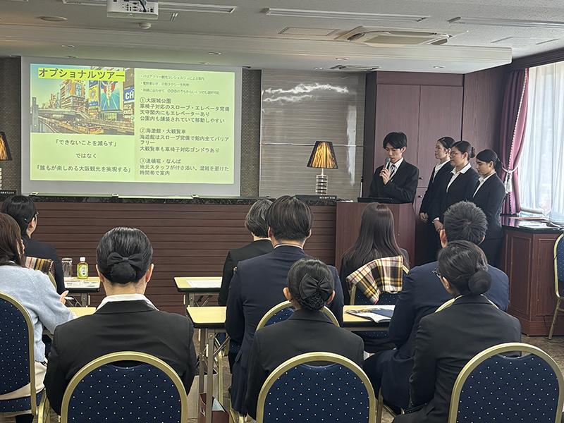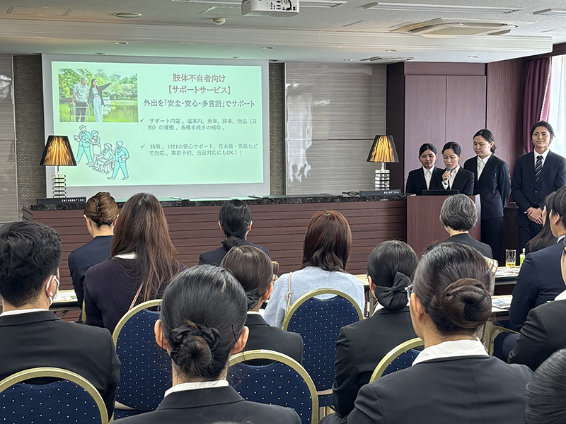 内定先の企業様をお迎えし、授業を通して考案した「障がいをお持ちの方にも心から楽しんでいただける宿泊プラン」を発表しました。
