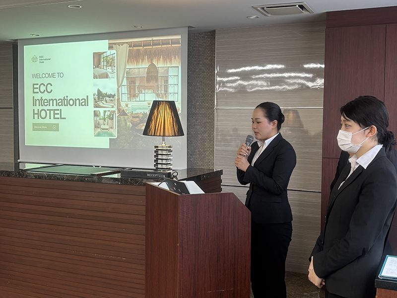 国際ホテルコース3年生のホテリエのひよこちゃんと、グローバルホテルコース2年生の合同授業にて、成果発表会を実施しました‼️